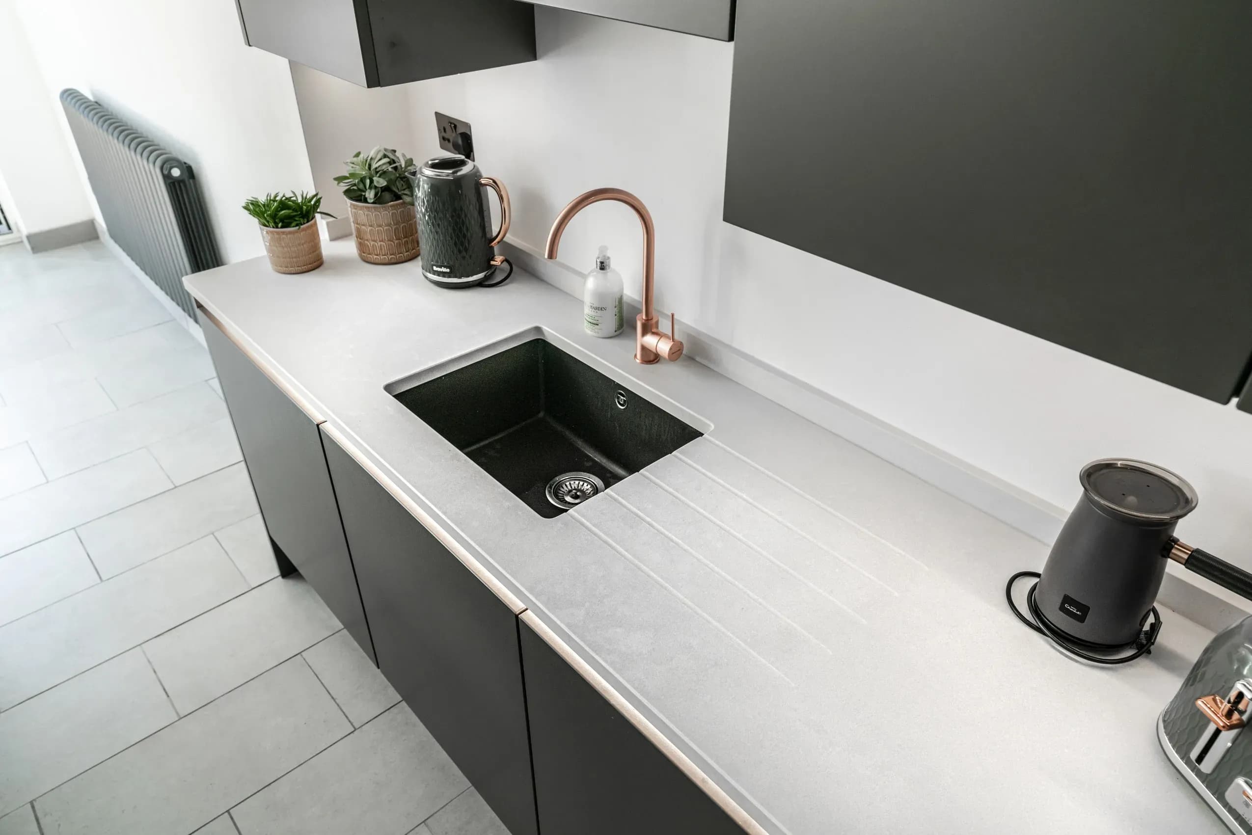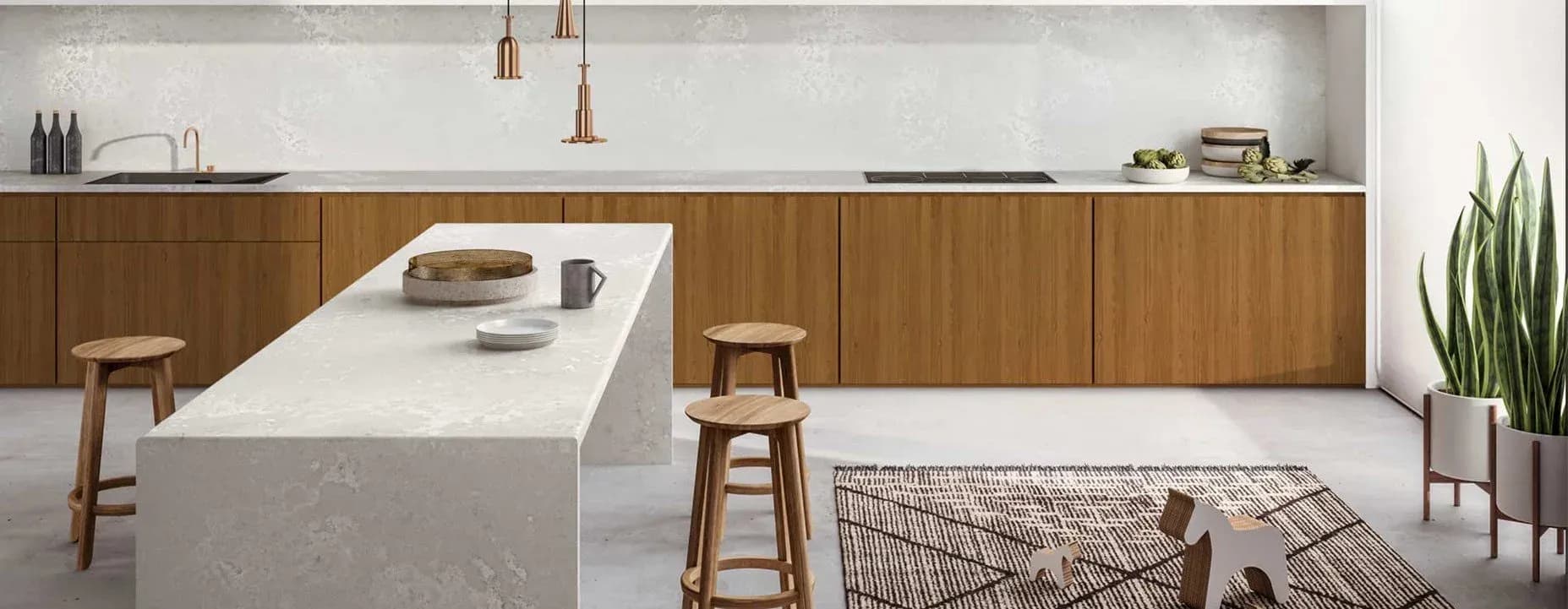Caesarstone is a beautiful engineered quartz stone which comprises approximately 93% natural quartz. Practical, durable and attractive, it has significant advantages over natural stone and other surfacing materials due to its superior strength and quality. Caesarstone is ideal for kitchen worktops, kitchen countertops, bathroom countertops, bathroom vanity units and quartz tiles. Every Caesarstone quartz worktop surface comes with a comprehensive 25 year guarantee to provide further peace of mind. Caesarstone is one of the most innovative quartz worktop manufacturers. We love the quality of the natural-stone alternatives. Ever since the ground-breaking London Grey, we have come to expect the very best, most natural-looking marble, limestone and travertine alternatives from the Israeli manufacturer. Slab sizes range from standard to jumbo Non-porous Clean with regular detergents No sealing or waxing Heat resistant